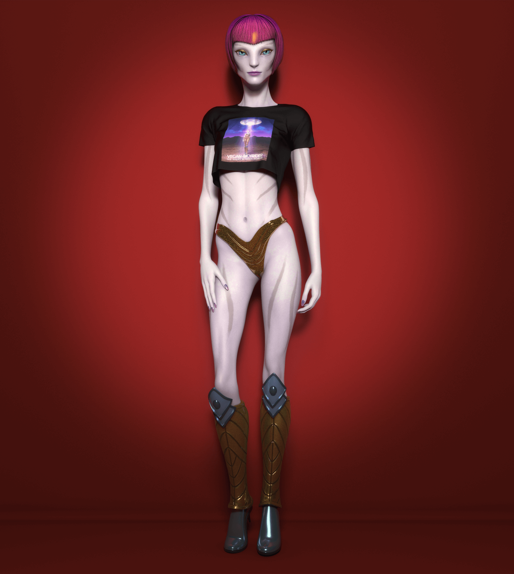 Through her, I explore identity, stillness, story, and the message behind every design. Shen is the frequency behind Vegan Skyrider. She is art in motion.